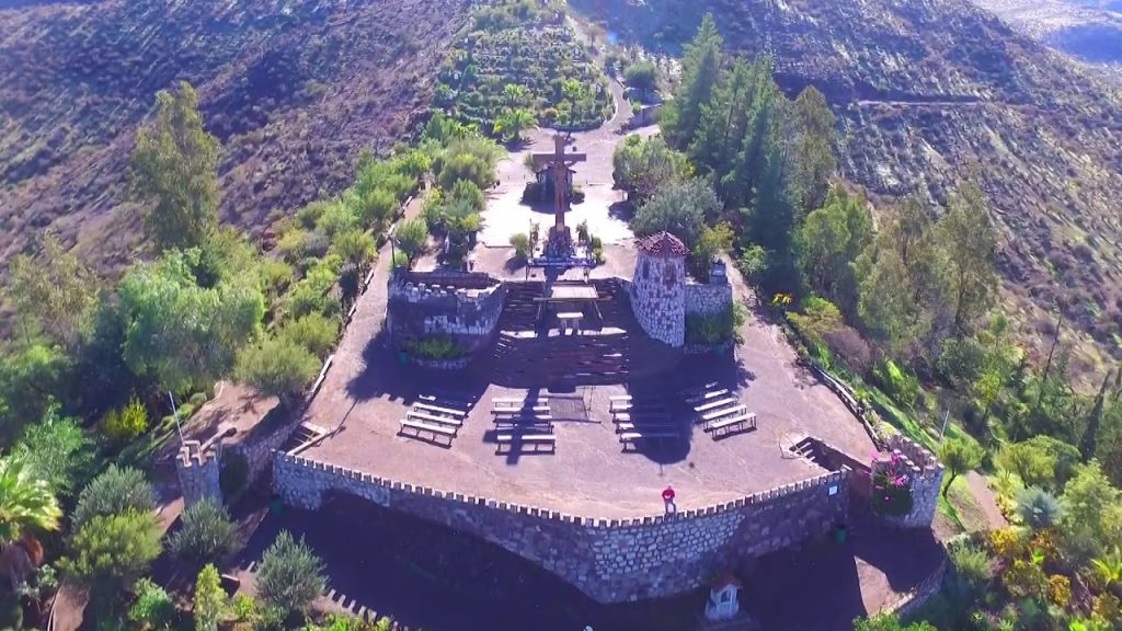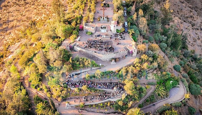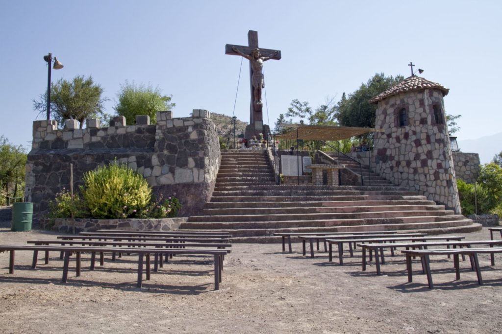 El santuario parte en un sendero decorado como jardín con árboles, flores y arbustos típicos de Chile. En cada curva del camino hay una estación del Via Crucis que muestran talladas en estela. La cima es vigilada por el Cristo Crucificado tallado en madera de gran dimensión, al que se llega tras recorrer los caminos. Desde ese lugar el visitante cuenta con una vista maravillosa del valle con la Cordillera de los Andes como telón de fondo.